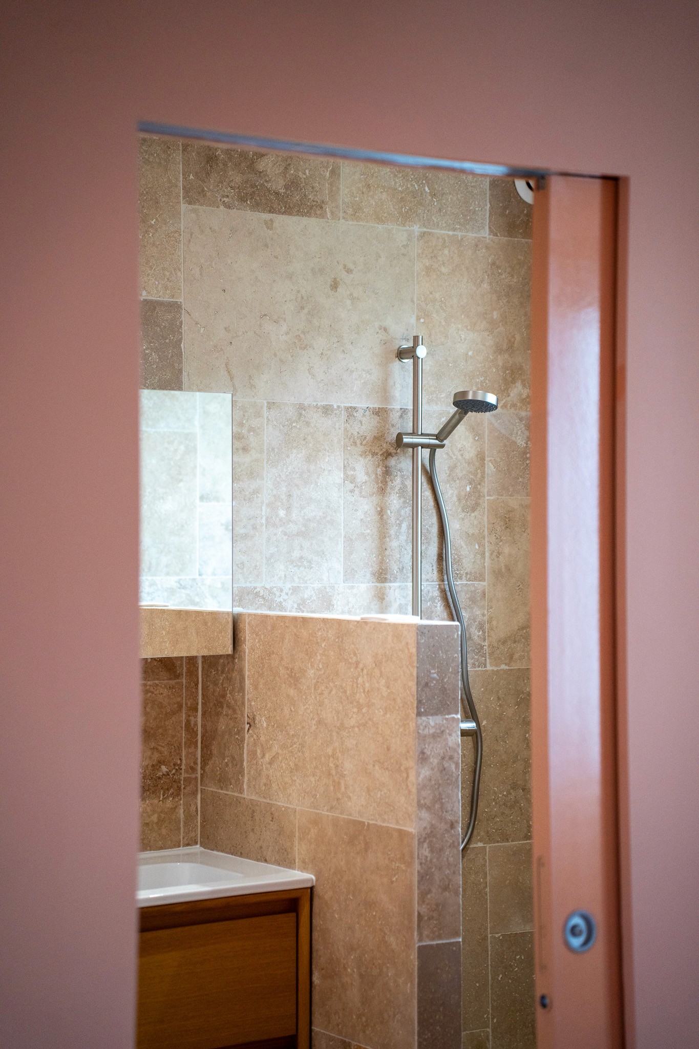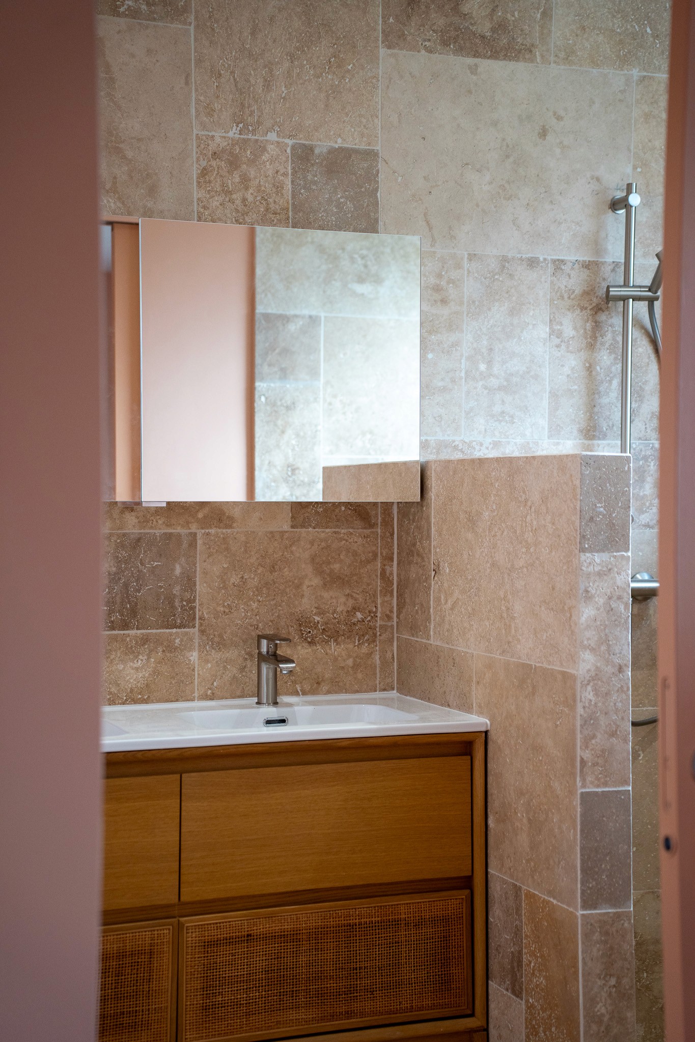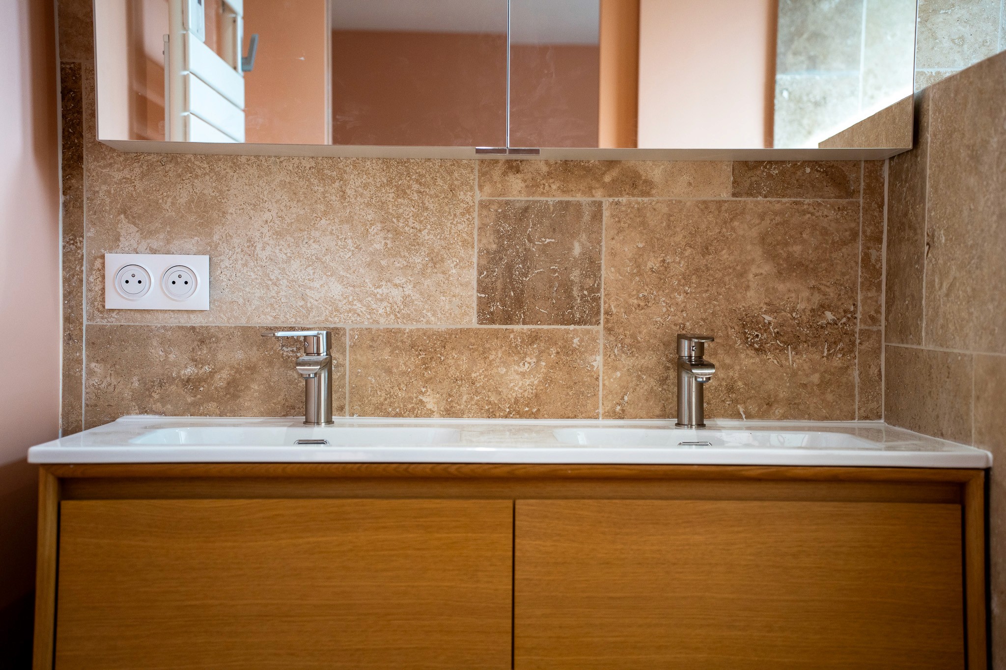 La création de la salle de bain a constitué un point central du chantier. Pose de faïence, installation des équipements sanitaires, agencement sur mesure… chaque détail a été pensé pour conjuguer esthétisme et praticité. Les sols ont également été rénovés avec la pose de nouveaux revêtements adaptés à chaque espace, apportant harmonie et continuité visuelle à l’ensemble de l’étage.